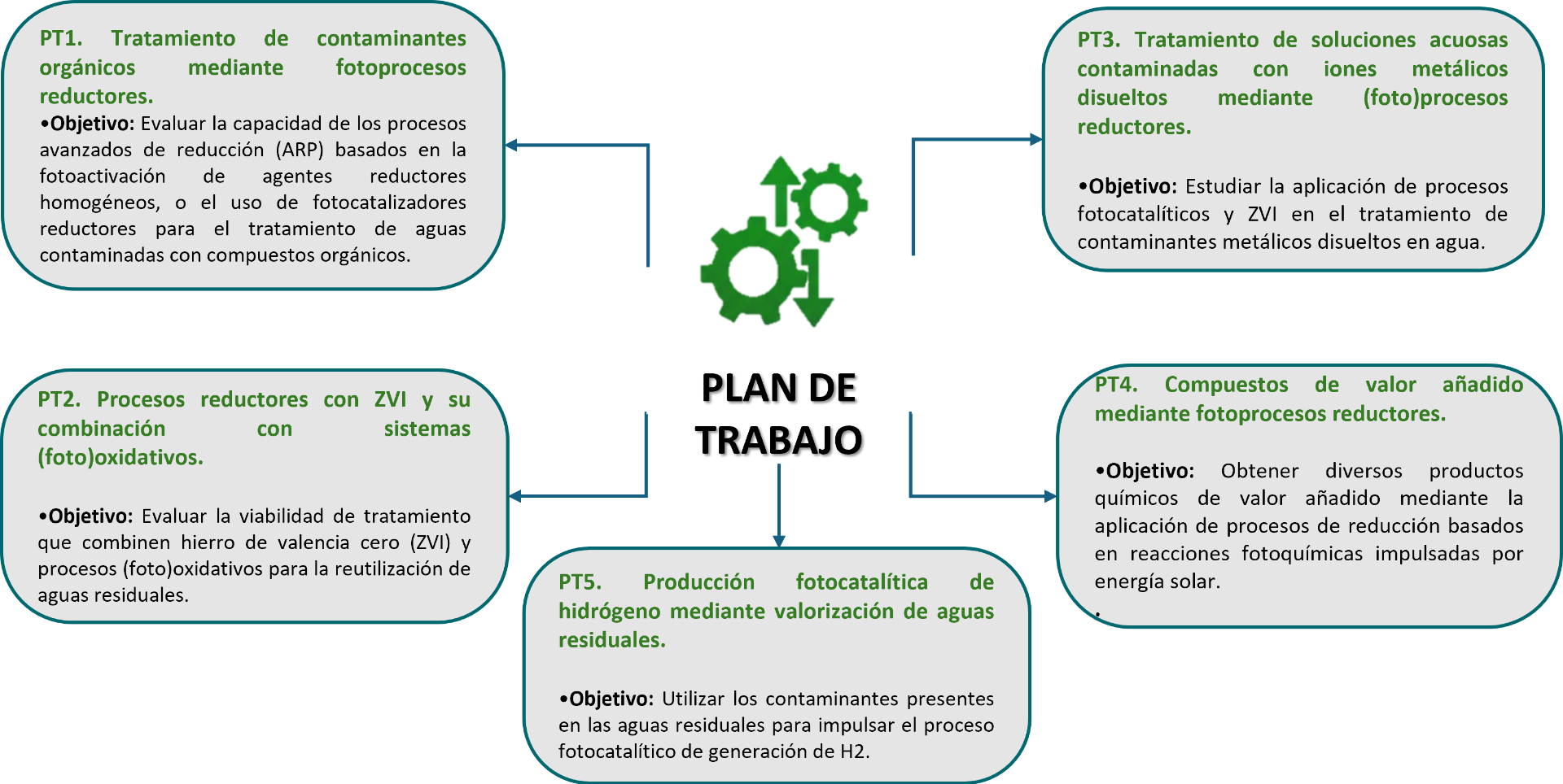 Desarrollar soluciones avanzadas para el tratamiento de efluentes complejos mediante la investigación y aplicación de Procesos Avanzados de Reducción (ARPs). Nuestra labor se centra en el empleo de ARPs para: 1) la eliminación eficiente de contaminantes metálicos y compuestos orgánicos persistentes en sistemas acuosos; 2) la valorización de aguas residuales mediante la obtención de productos químicos de interés y 3) la producción fotocatalítica de H₂ y H₂O₂, todo ello bajo un modelo de economía circular.